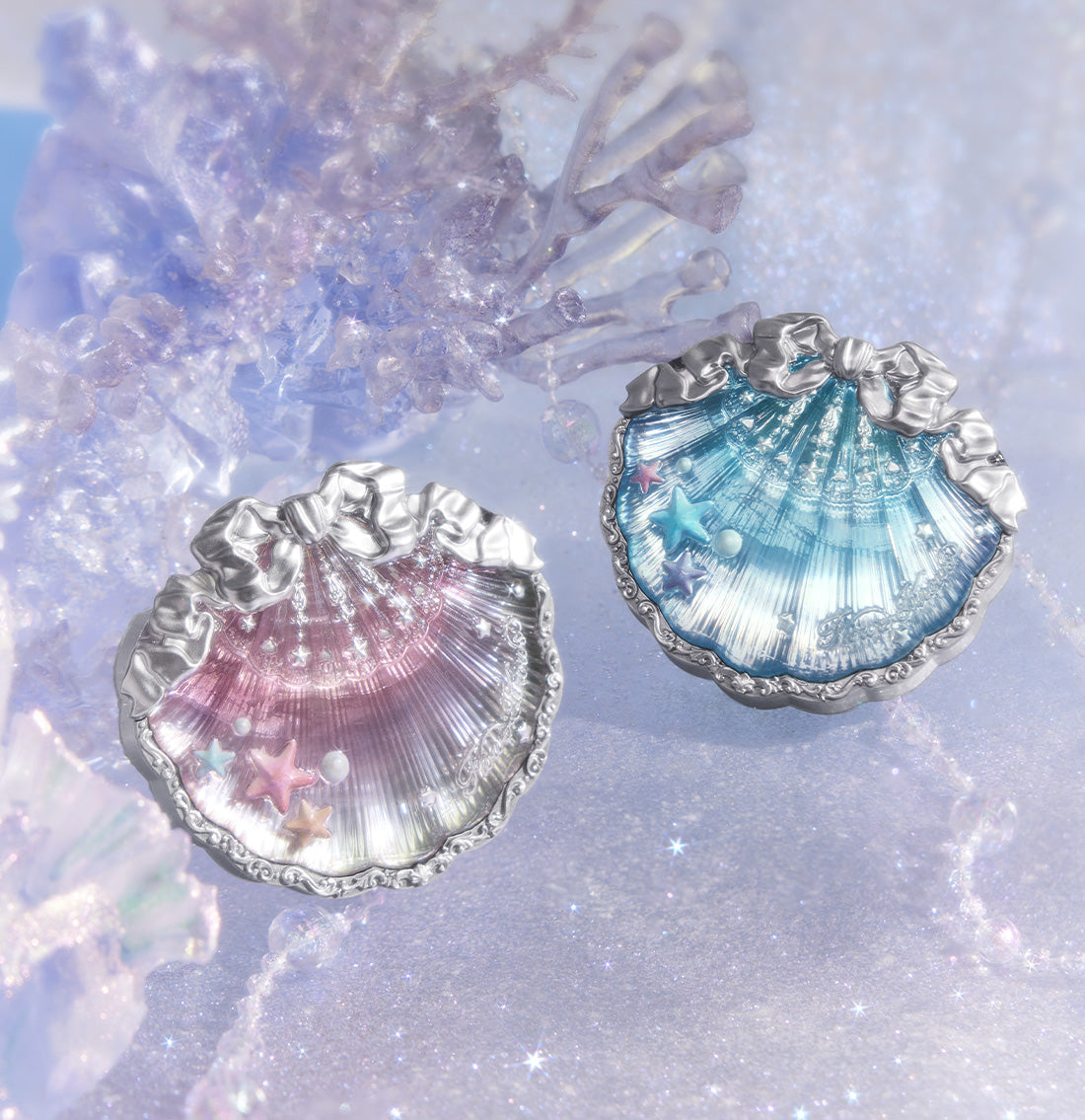 Sculpted silver details add a touch of polish, while the holographic shell sparkles with the colors of the sea.