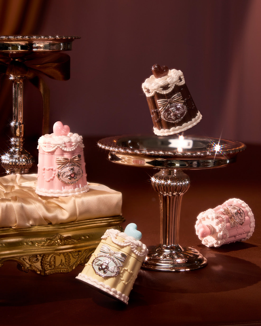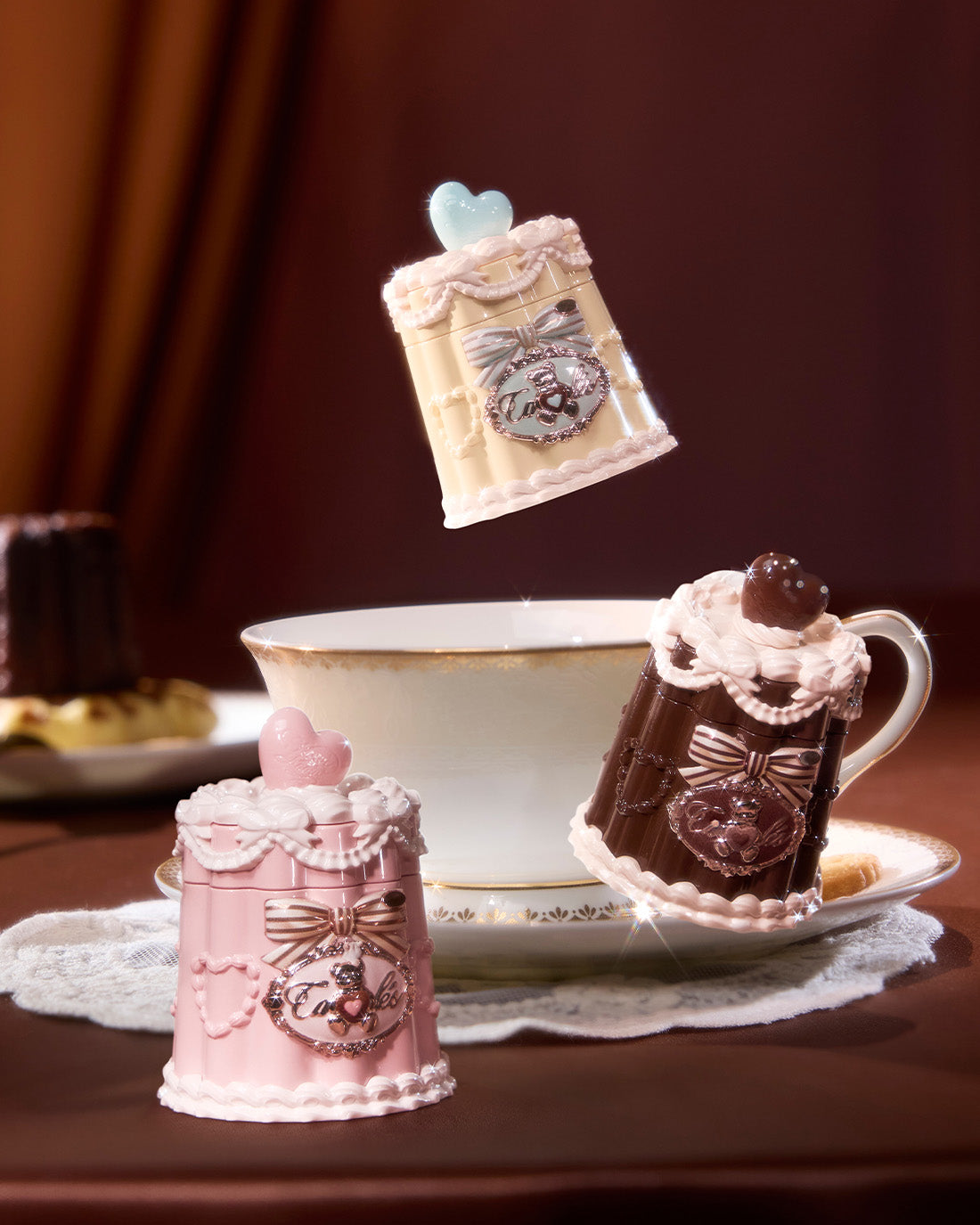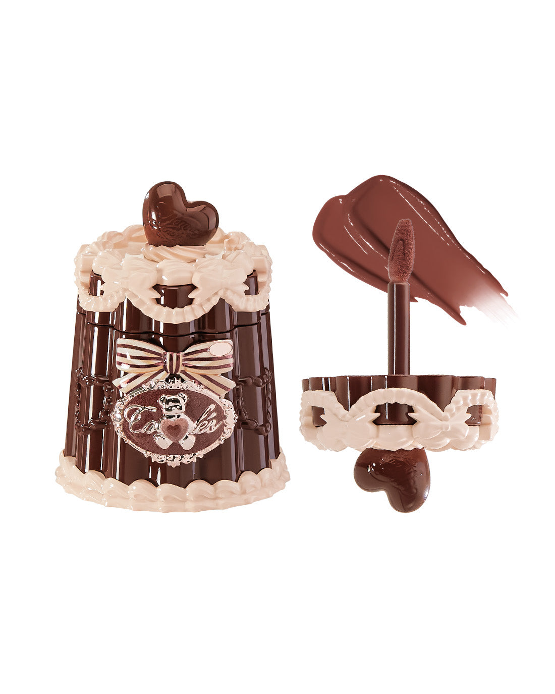 A chubby heart-shaped chocolate sits atop the caramel-like shell, gleaming with a tempting luster under the light.