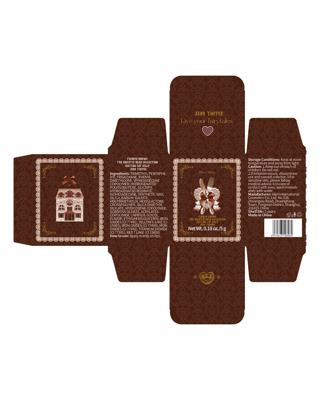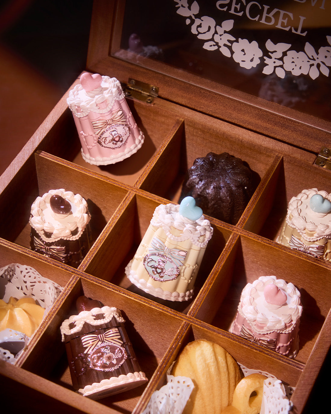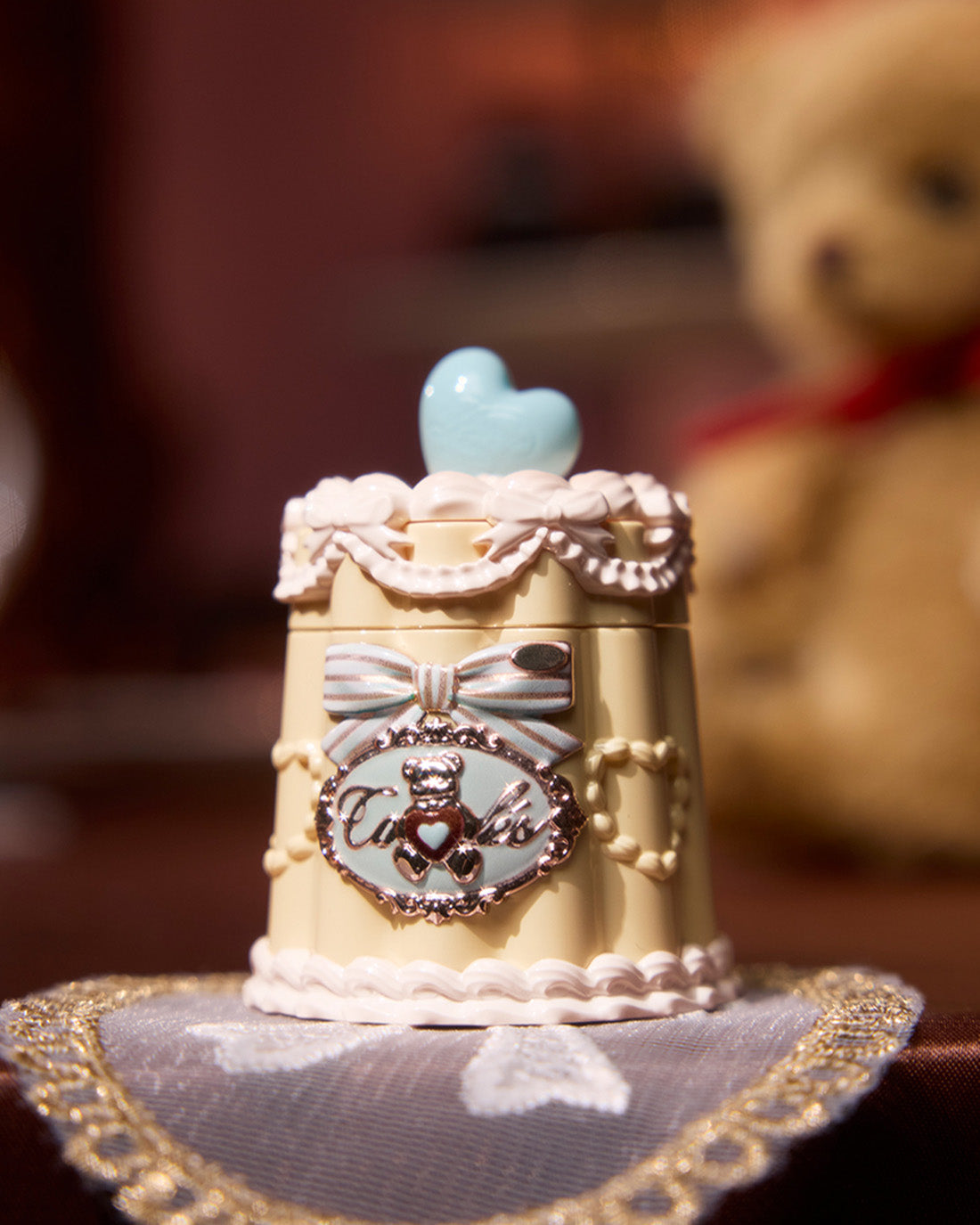 A chubby heart-shaped chocolate sits atop the caramel-like shell, gleaming with a tempting luster under the light.