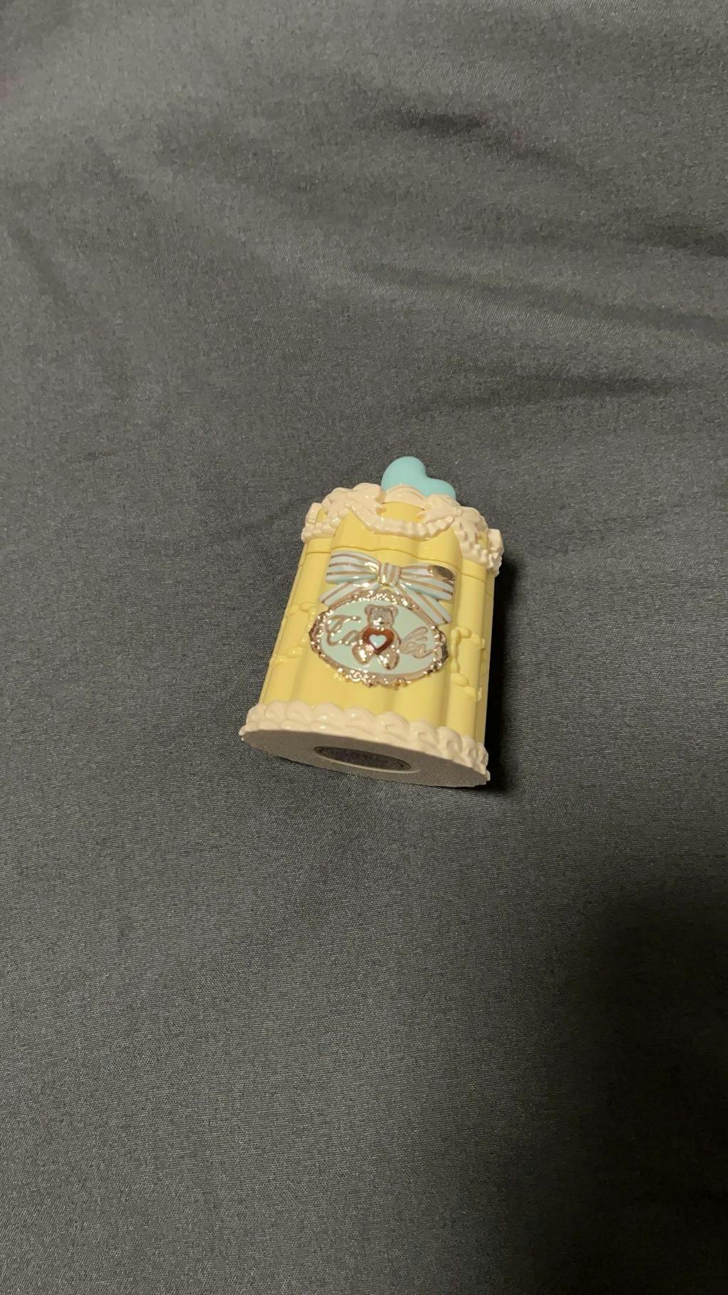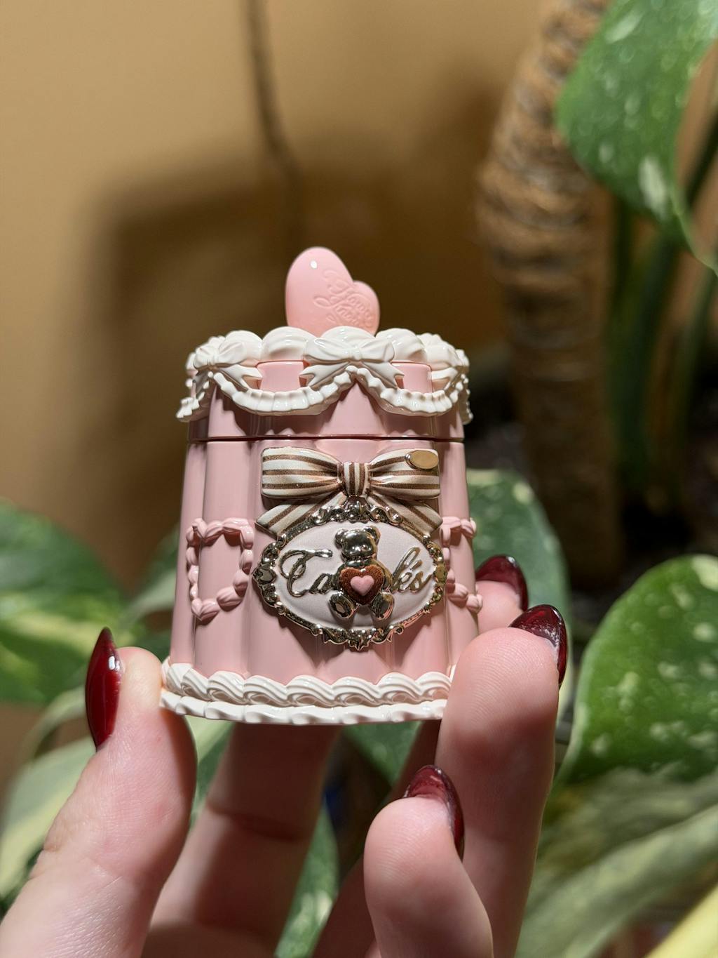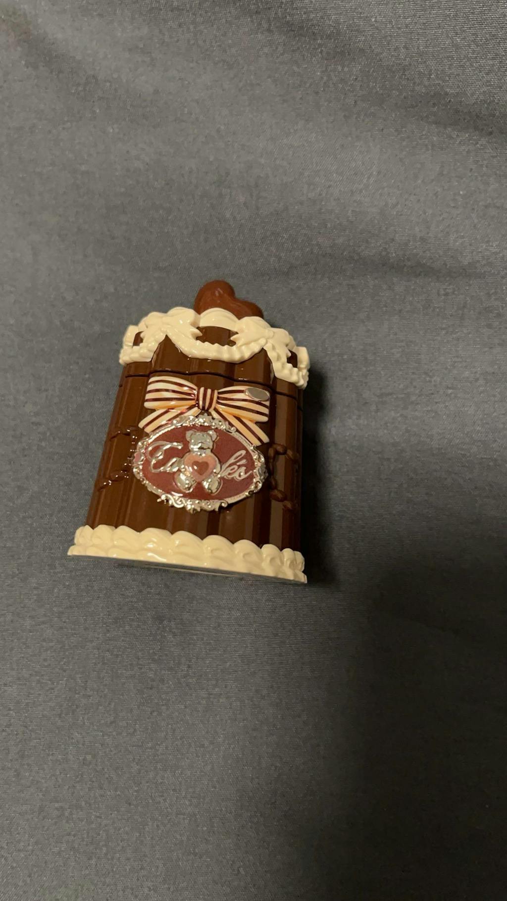 A chubby heart-shaped chocolate sits atop the caramel-like shell, gleaming with a tempting luster under the light.