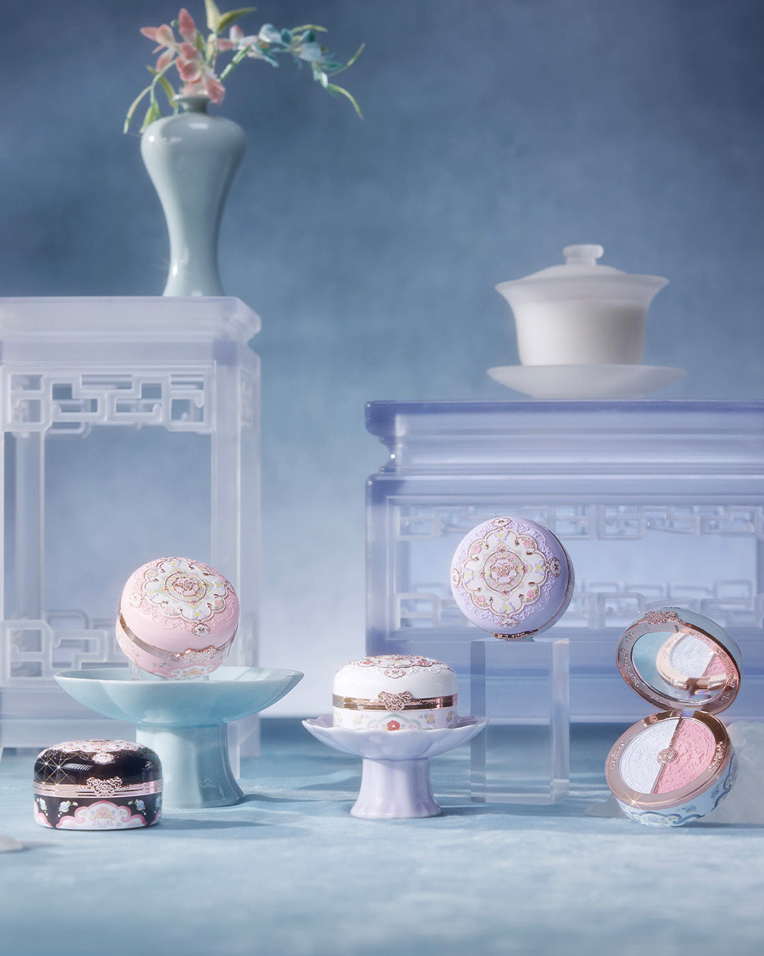This compact is adorned with fluttering butterflies, delicate floral detailing, and Ruyi-style designs. Gold accents add a touch of luxury to its sleek, portable form.
