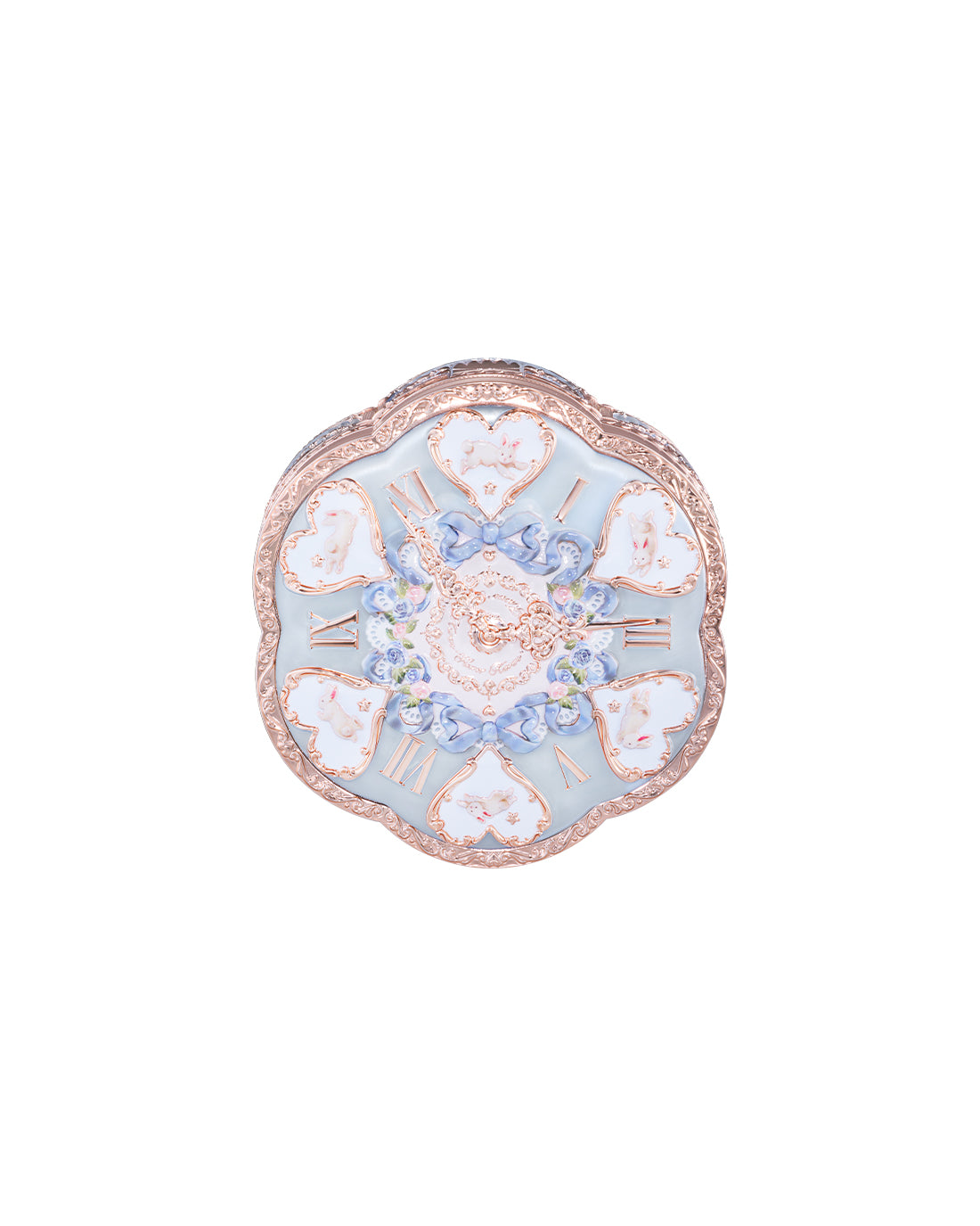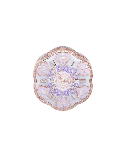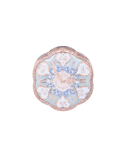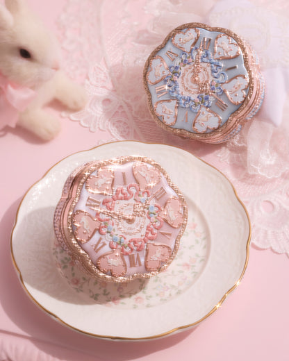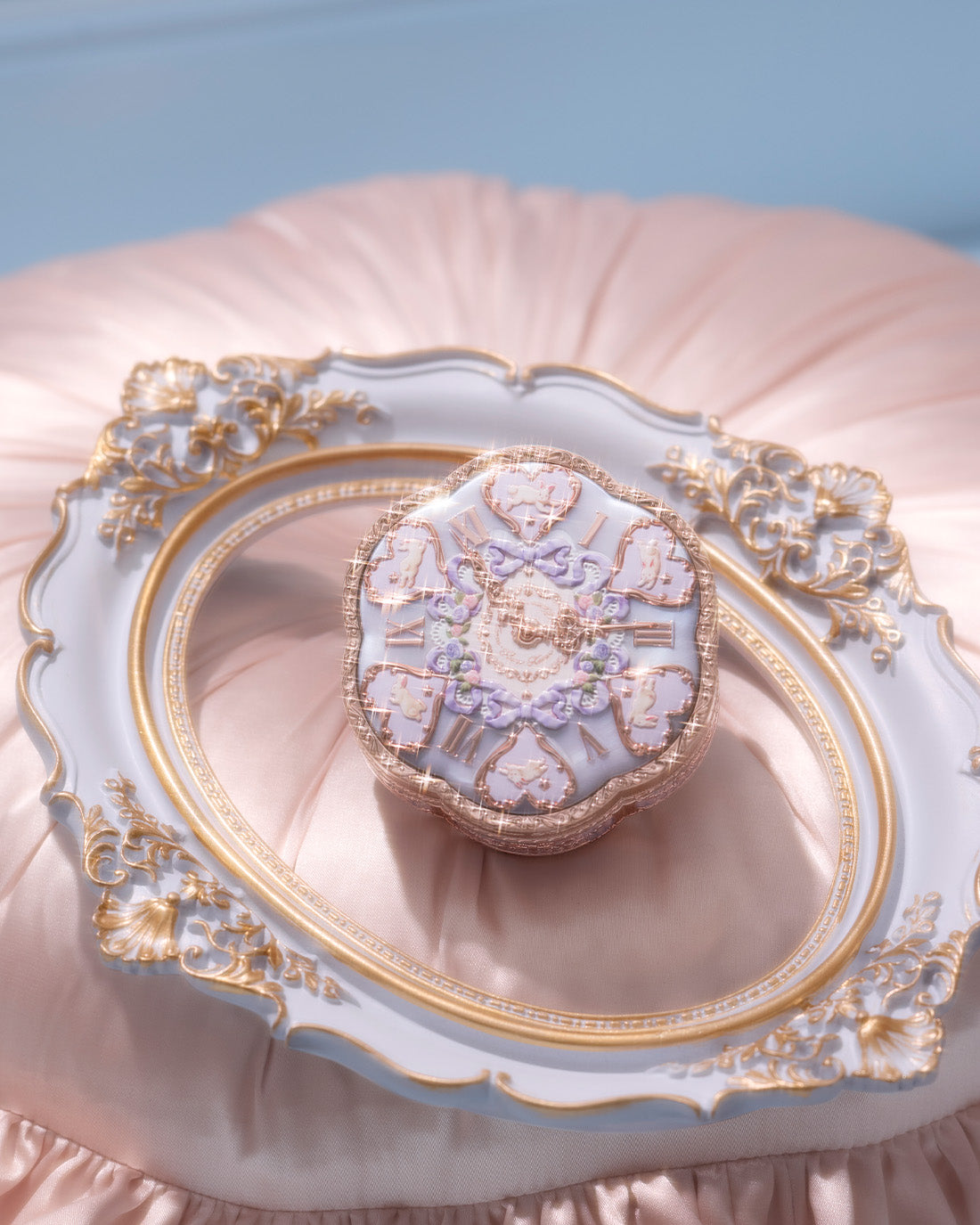 Rococo curves, molten-gold edges, and a clock-kissed lid with pearly glow.