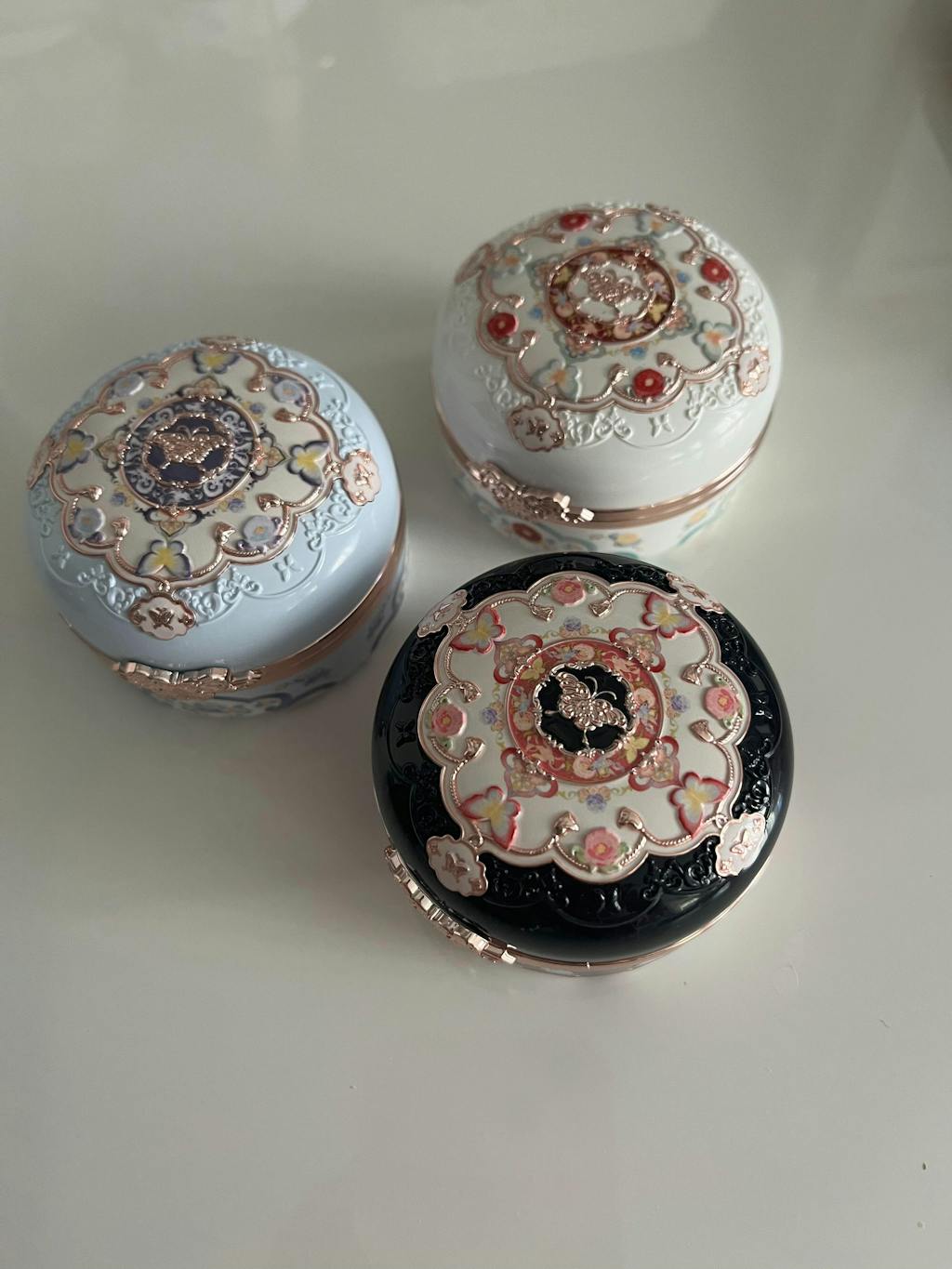 This compact is adorned with fluttering butterflies, delicate floral detailing, and Ruyi-style designs. Gold accents add a touch of luxury to its sleek, portable form.